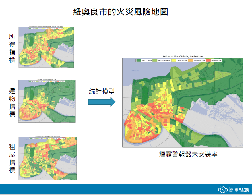 - 綜合各種指標進行分析:所得指標、建物指標、租屋指標、獨居老人、一家之主的年齡、家裡是否有小孩等等 → 統計模型 → 煙霧警報器未安裝率 → 確認優先發放警報器的地方,最後幫助市府發送了8,000個
